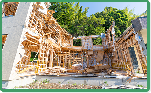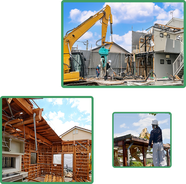 などのようなお悩みに寄り添い、建物に応じた適切な対応を行います。放置された空き家や廃屋など、処理に困っている物件の解体もお任せください。